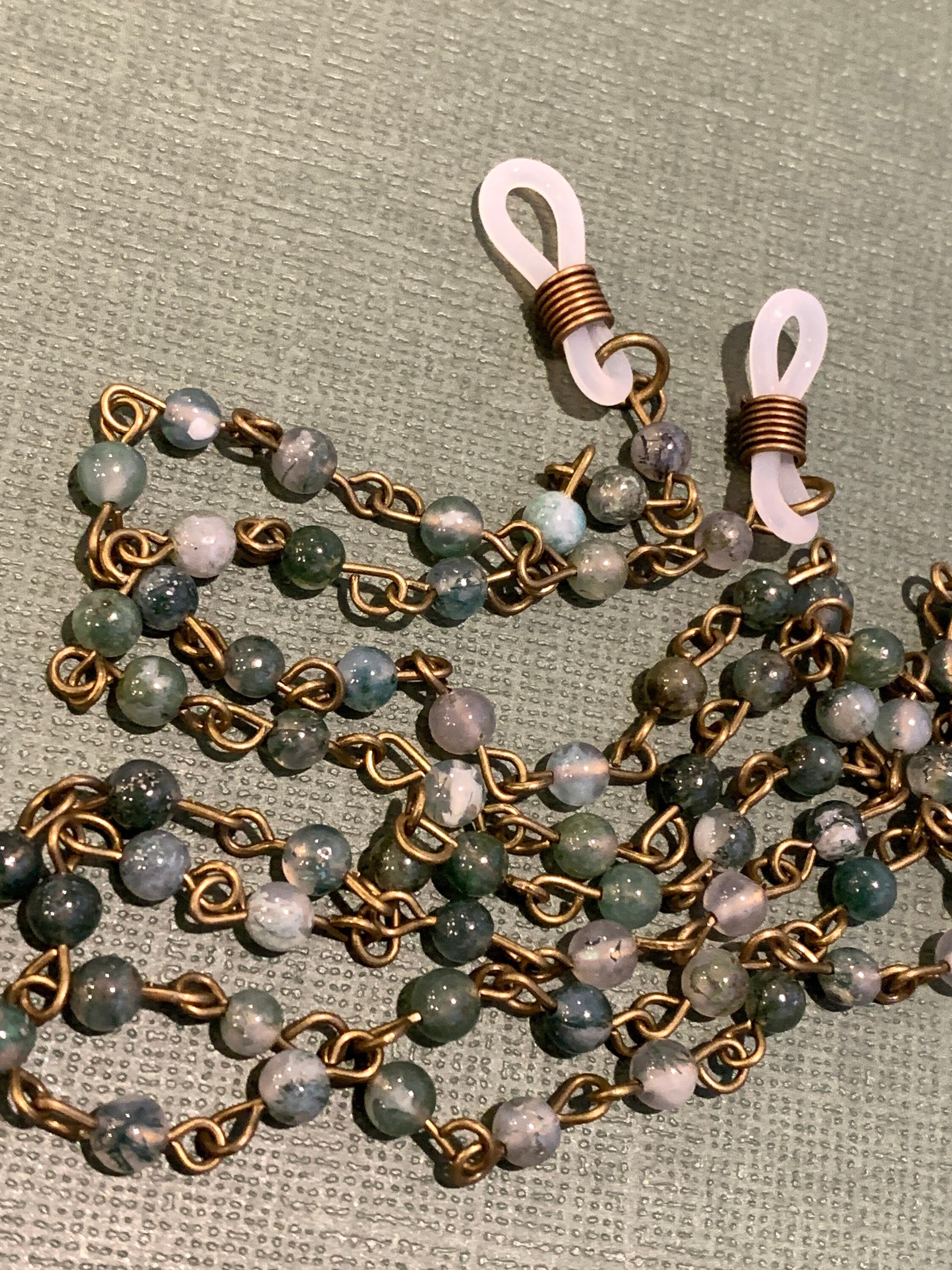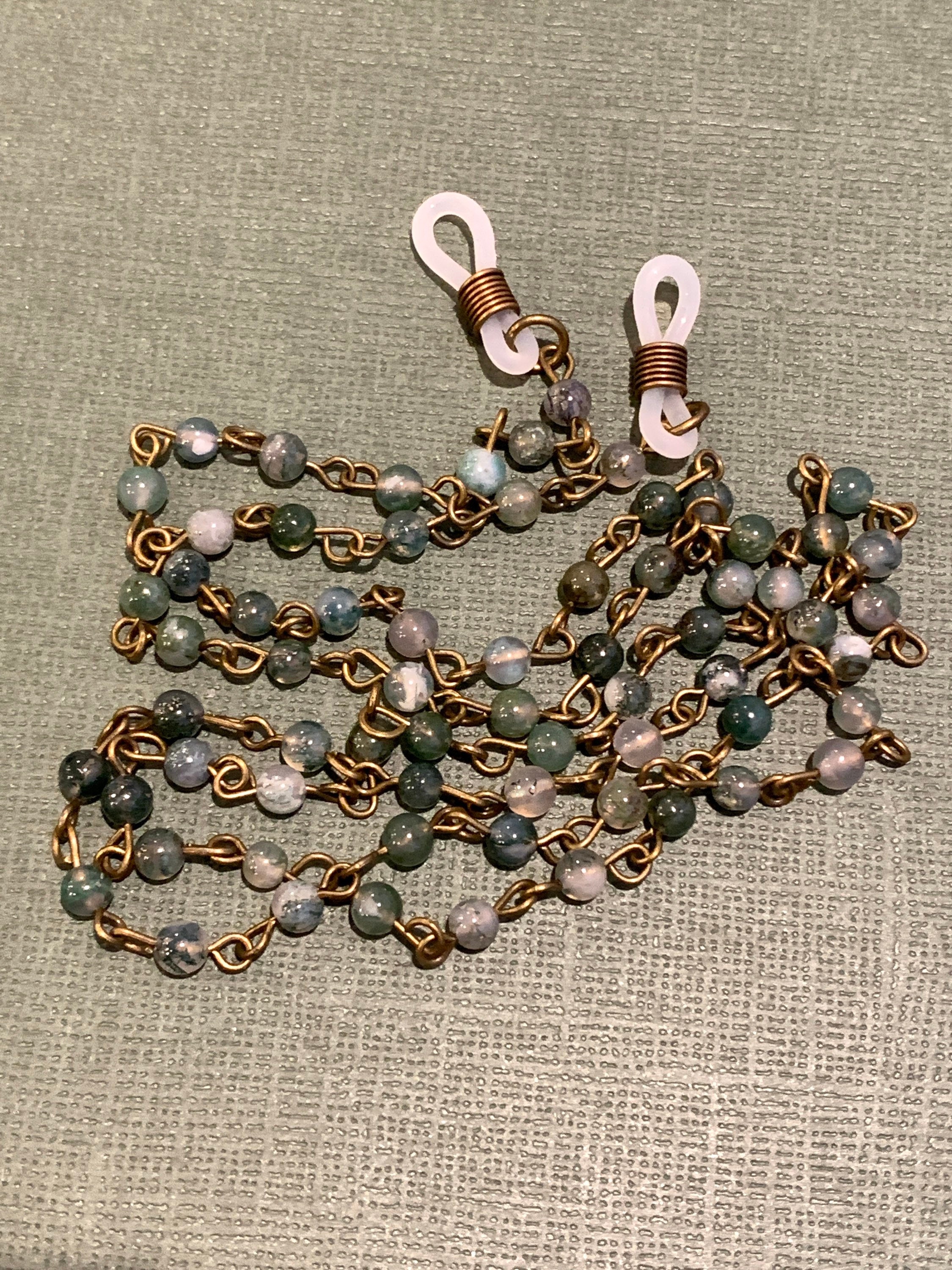 -The chain has two white rubber loops to hold the eye-glasses and this can be changes if requested.