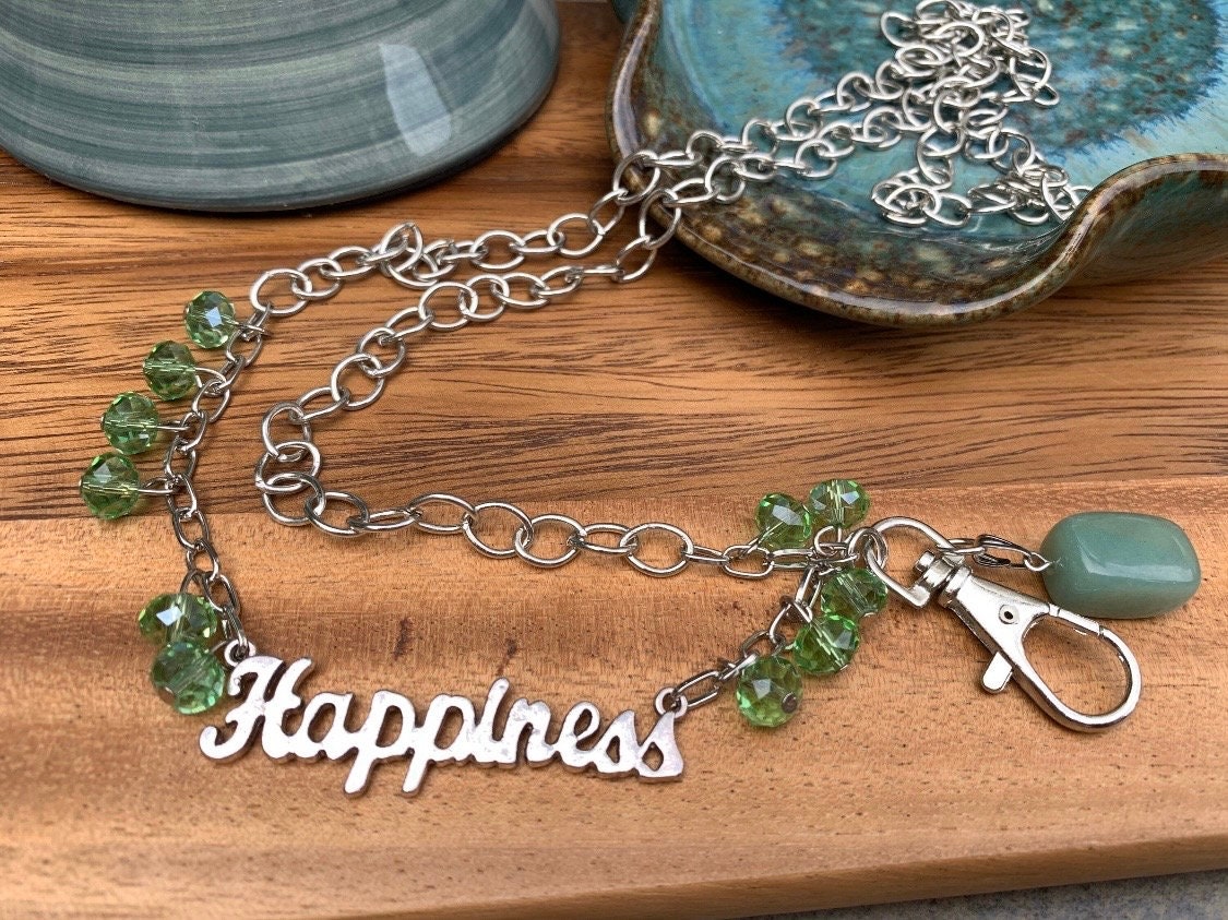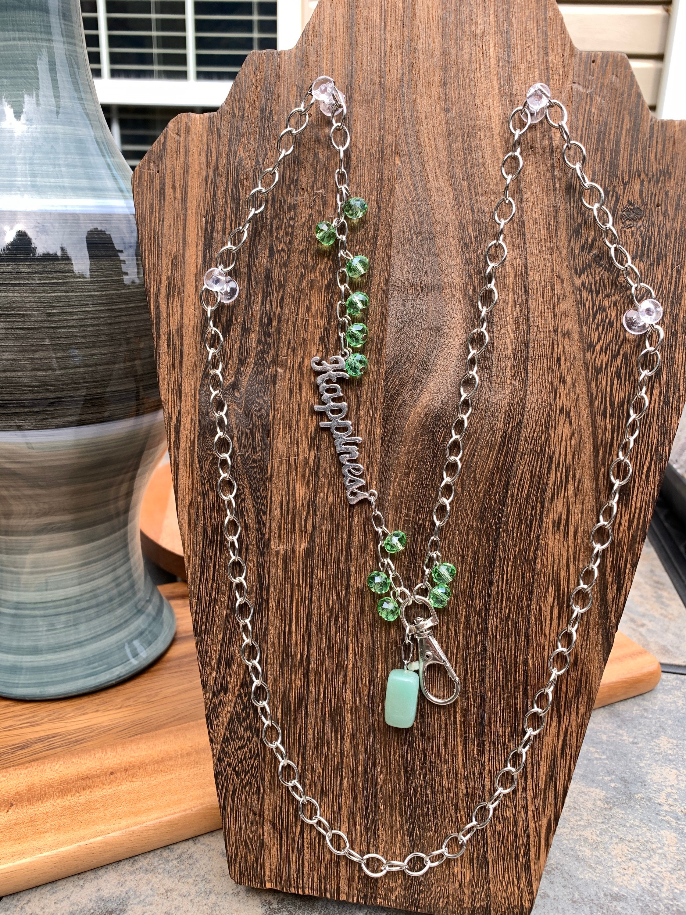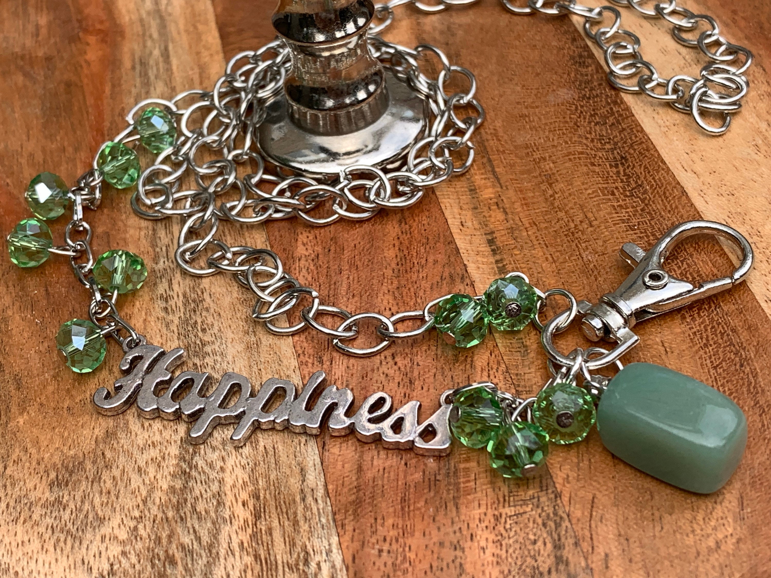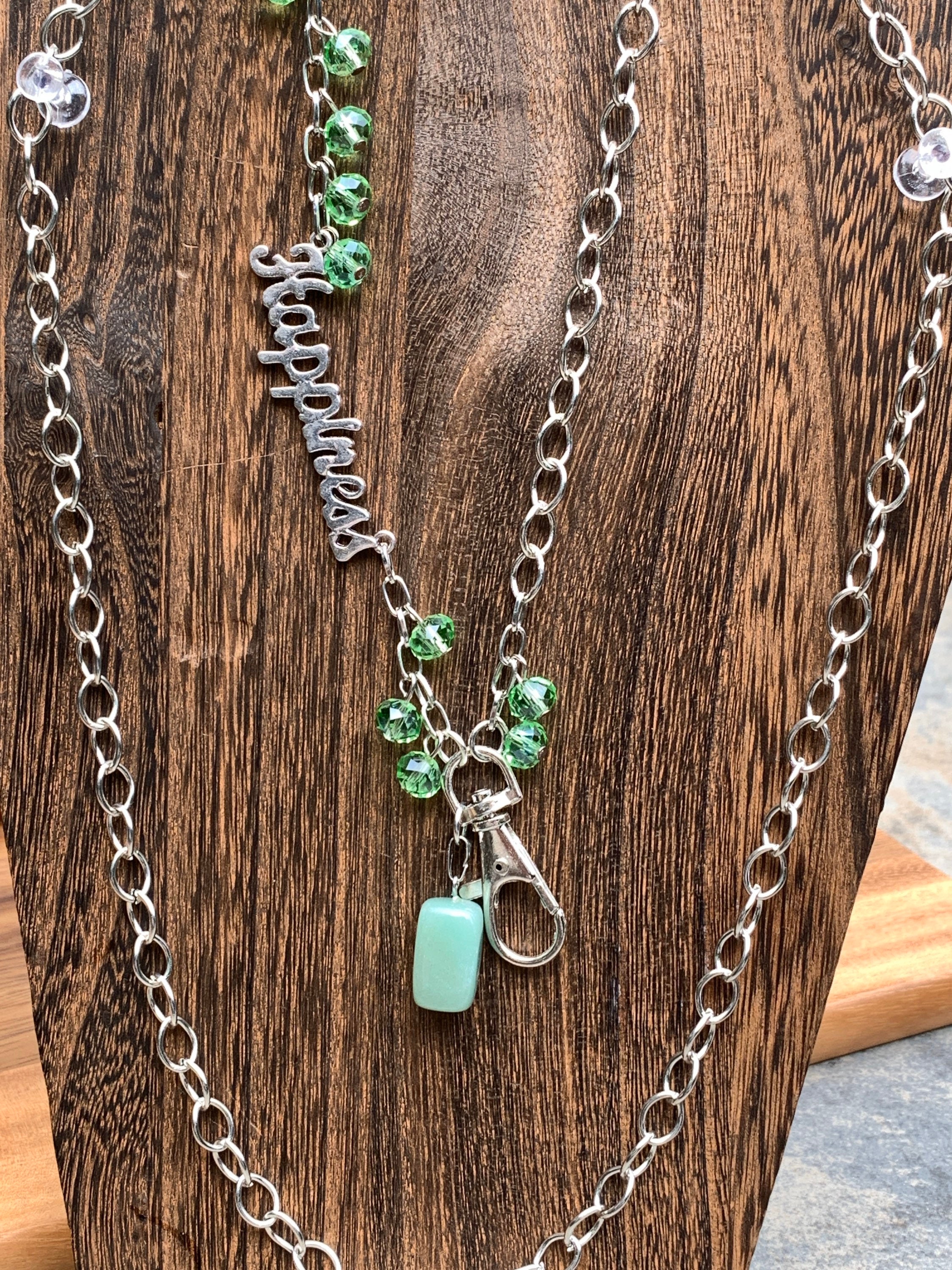 Green Stone Lanyard Glass beads with Happiness Silver tone Chain Badge ID Holder Keys badge holder Eyeglasses Necklace 32”-36” Customized