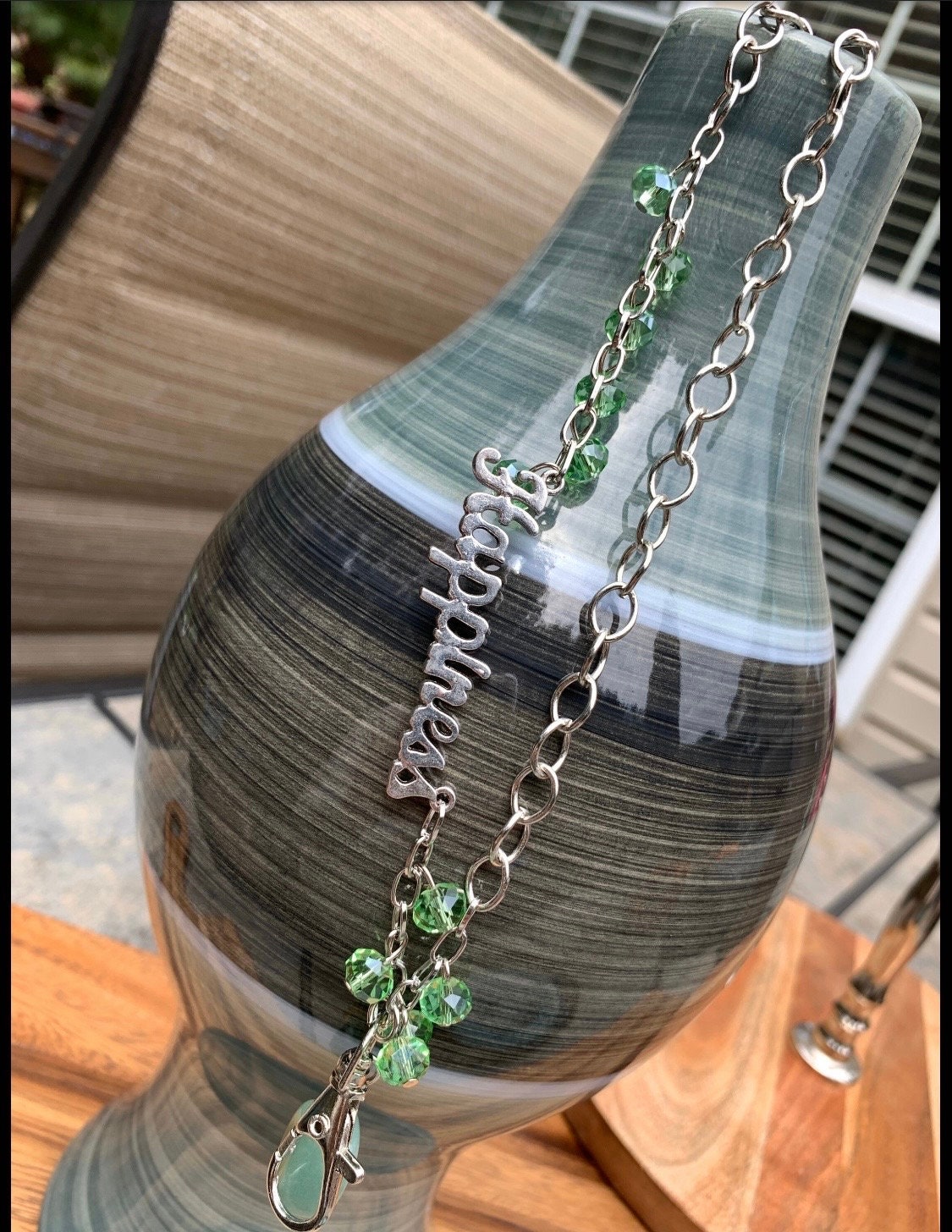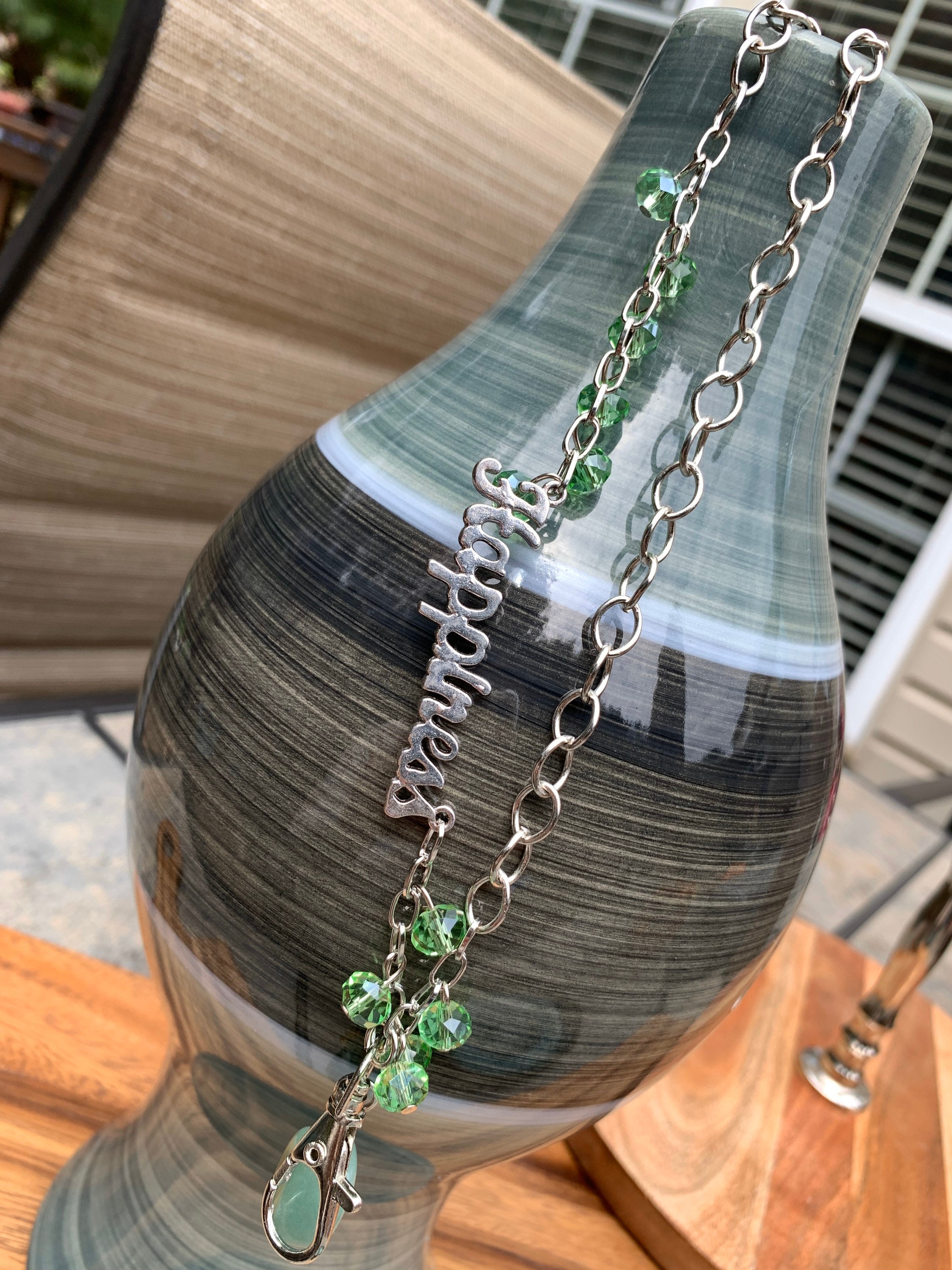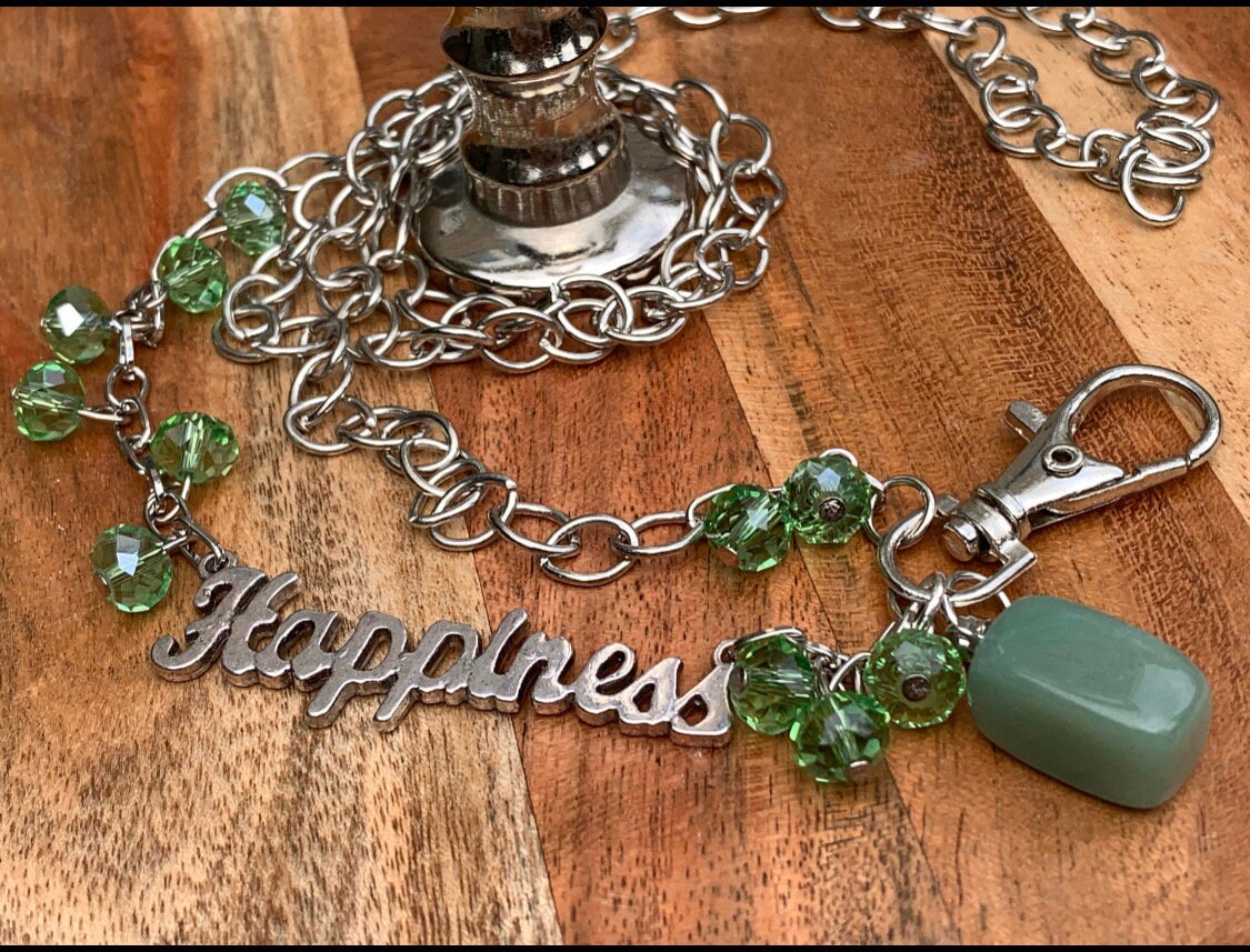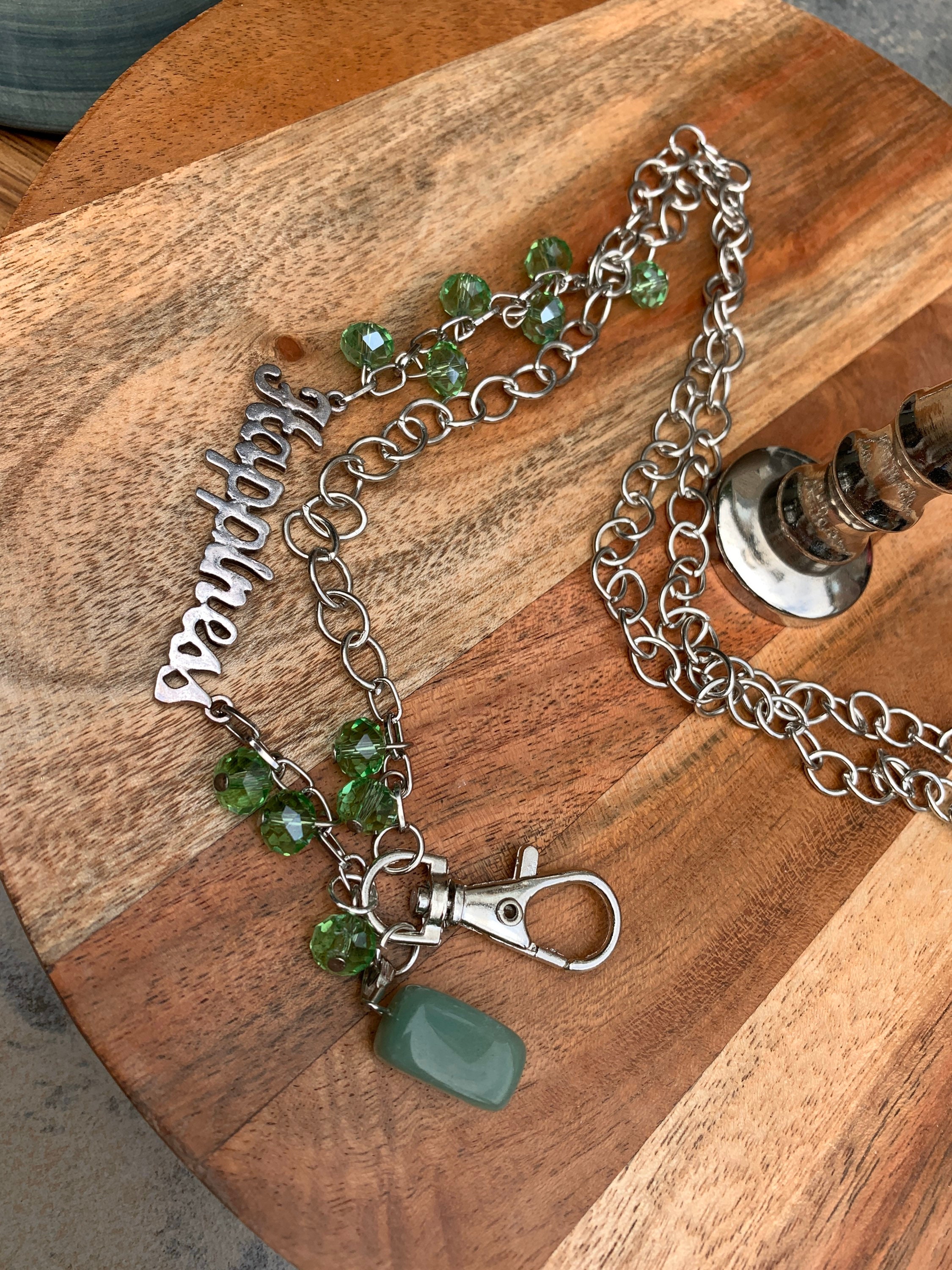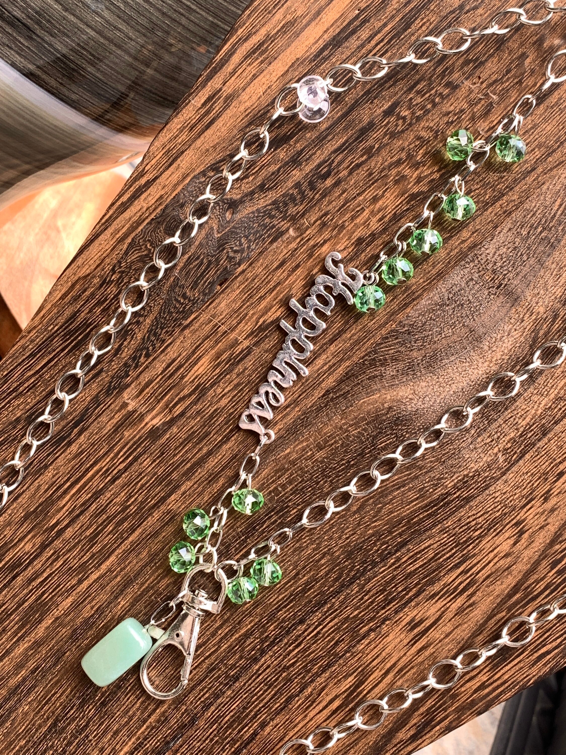Green Stone Lanyard Glass beads with Happiness Silver tone Chain Badge ID Holder Keys badge holder Eyeglasses Necklace 32”-36” Customized