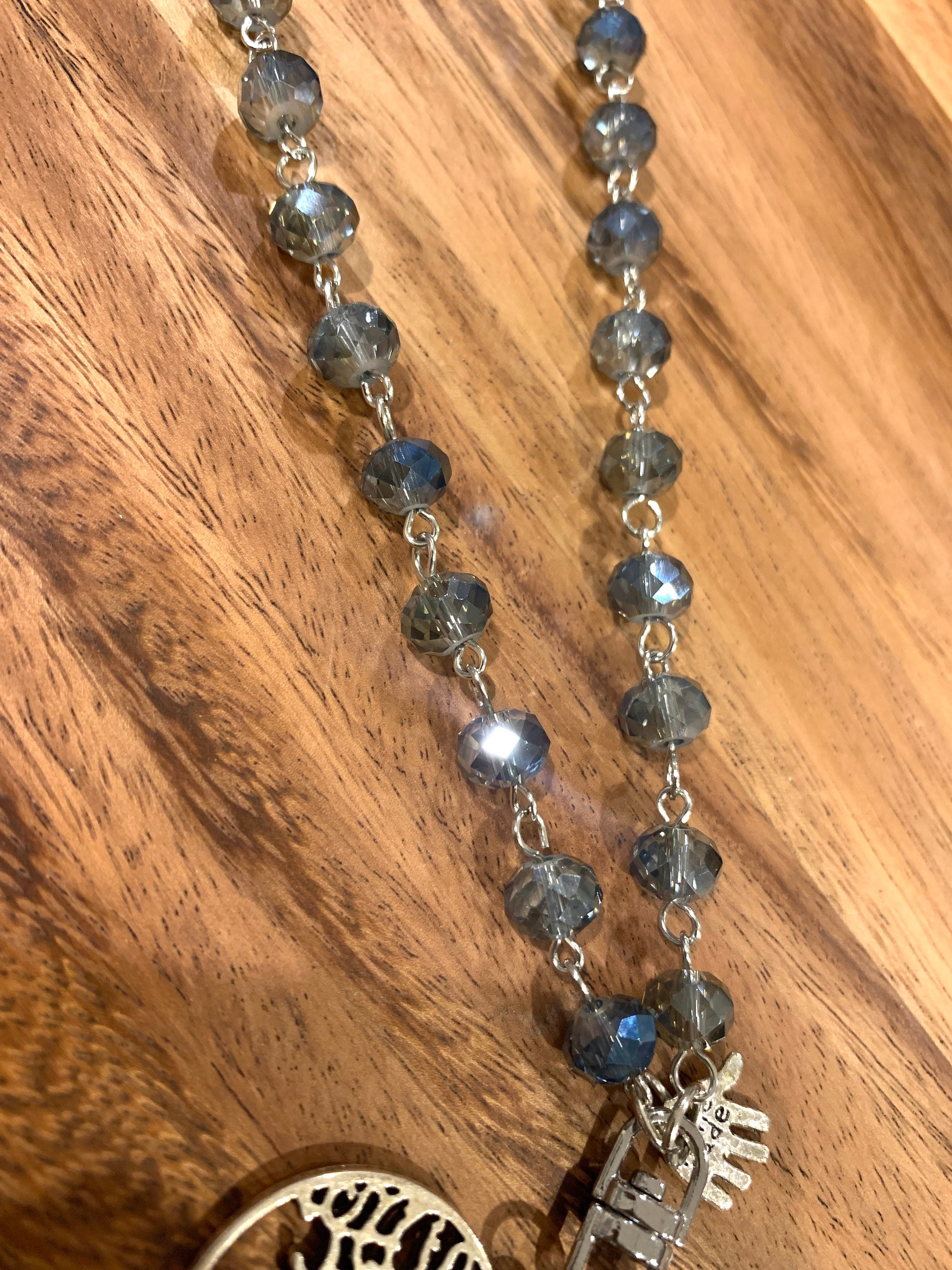 Brown Faux Leather Lanyard gray Blue transparent facet Glass beads Necklace silver tone Chain Keys Badge ID Holder 32”-36” Follow your heart